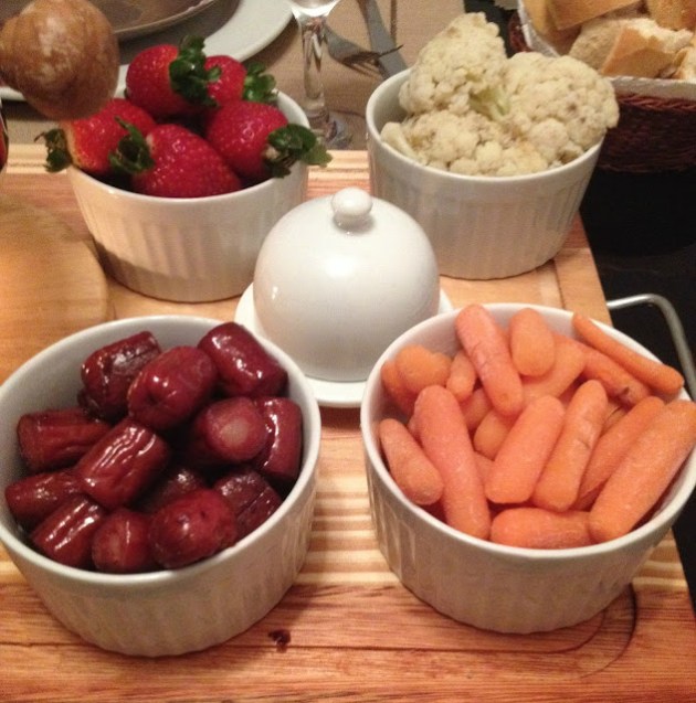 Mas nem só de pão vive o fondue de queijo, pelo menos não aqui em casa!! Costumo servir com diversos acompanhamento diferentes, a linguiça é um dos meus preferidos, sempre tem quando faço fondue tem linguiça, sirvo também com baby cenouras cozidas, couve-flor cozida, algumas frutas, dá para usar brócolis, e uma coisa que eu amava colocar como acompanhamento, mas não encontro mais para vender era o chicken pop corn, mas pode ser substituído por nuggets cortado em cubinhos também.