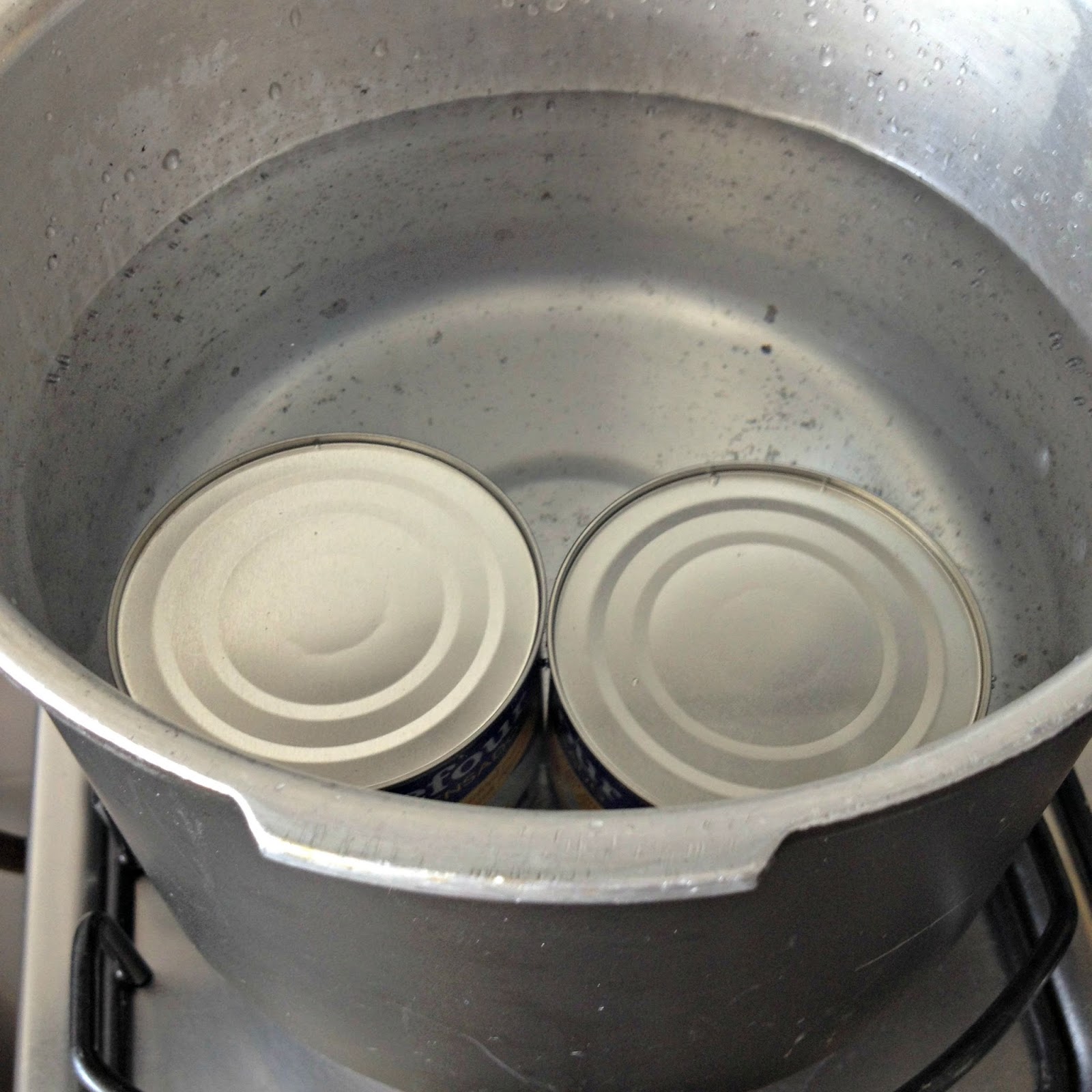 O importante é que as latas de leite condensado não sejam daquelas do tipo abre fácil, elas devem ser tradicionais, que só são abertas com abridor de latas, se não você corre o risco da lata abrir dentro da panela.