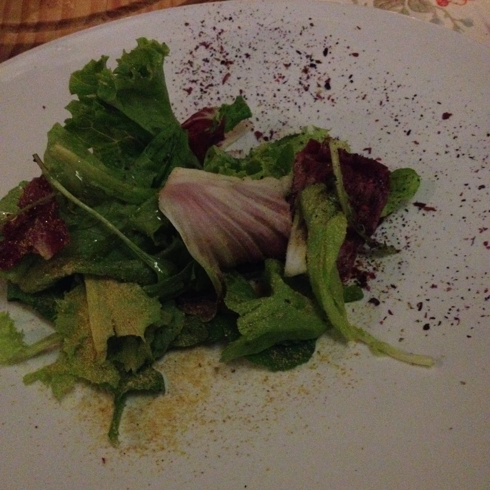 Após a linguiça somos servidos com uma salada harmonizada com um Savignon blanc da Valduga.