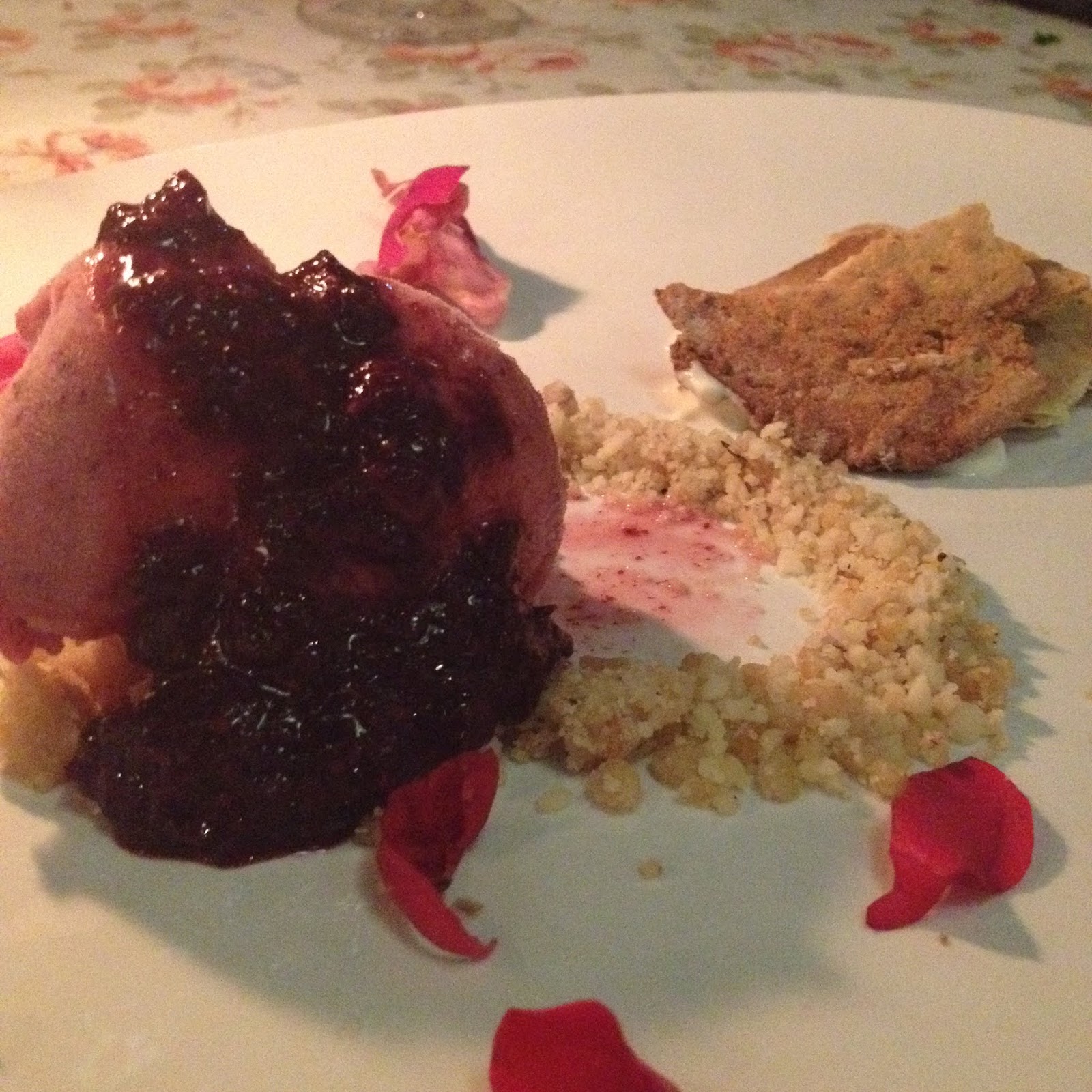 Finalizado os pratos salgados vamos nós às sobremesas, sourbet de futas vermelhas, acompanhado de farofa de praliné e um biscoitinho delicioso. Harmonizado com Aurora colheita tardia, que não é um dos meus tipos de vinho preferidos, mas casou bem com essa sobremesa.