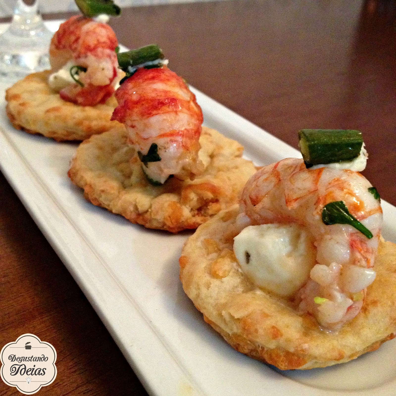 Sobre as bolachas de grana padano coloque uma colher de sobremesa de cream cheese, em formato de bolinha, “encaixe” o lagostim sobre essa bolinha de queijo molhe com um pouquinho da manteiga e sirva.