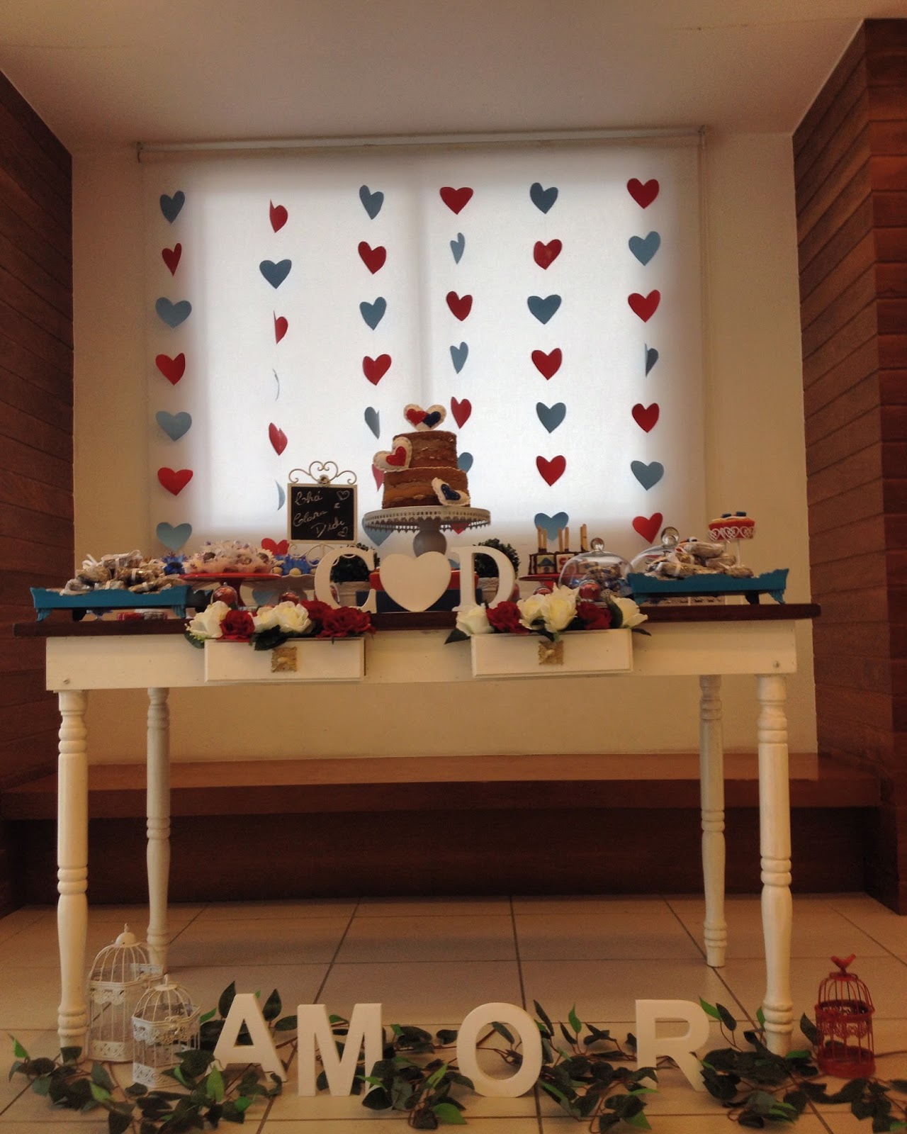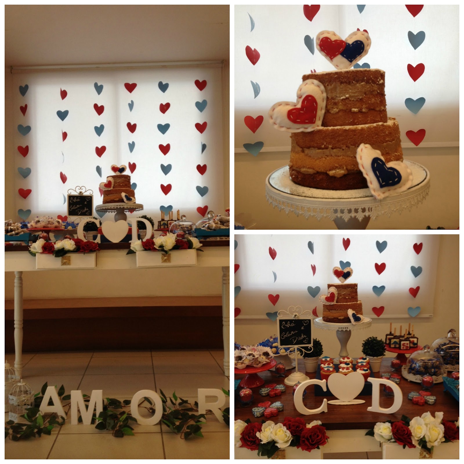As cores escolhidas foram azul e vermelho, pois tinha muita coisa guardada do meu chá e do meu aniversário, as louças foram quase todas minhas, alugamos a mesa por um preço super bacana, tem o contato da pessoa no fim do post e o resto foi tudo DIY, eram muitas mãos para ajudar!
