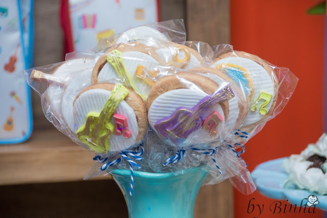 Teve também esse caixinhas com jujuba, que colei as notas musicais de EVA e o laço de cetim.E se vocês olharem bem a foto tem um violão cheio de confete.