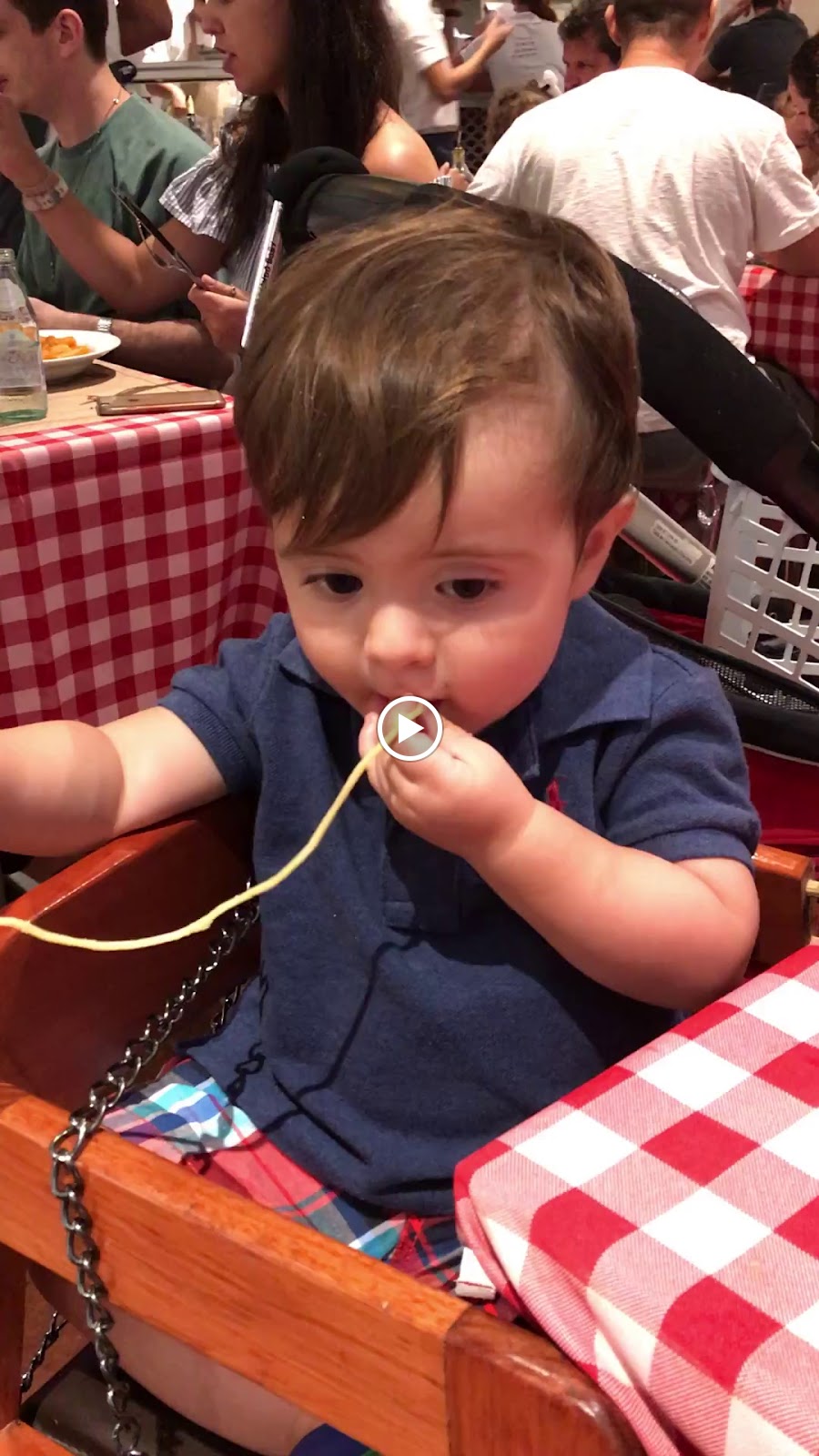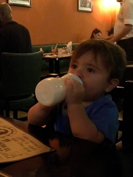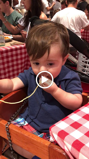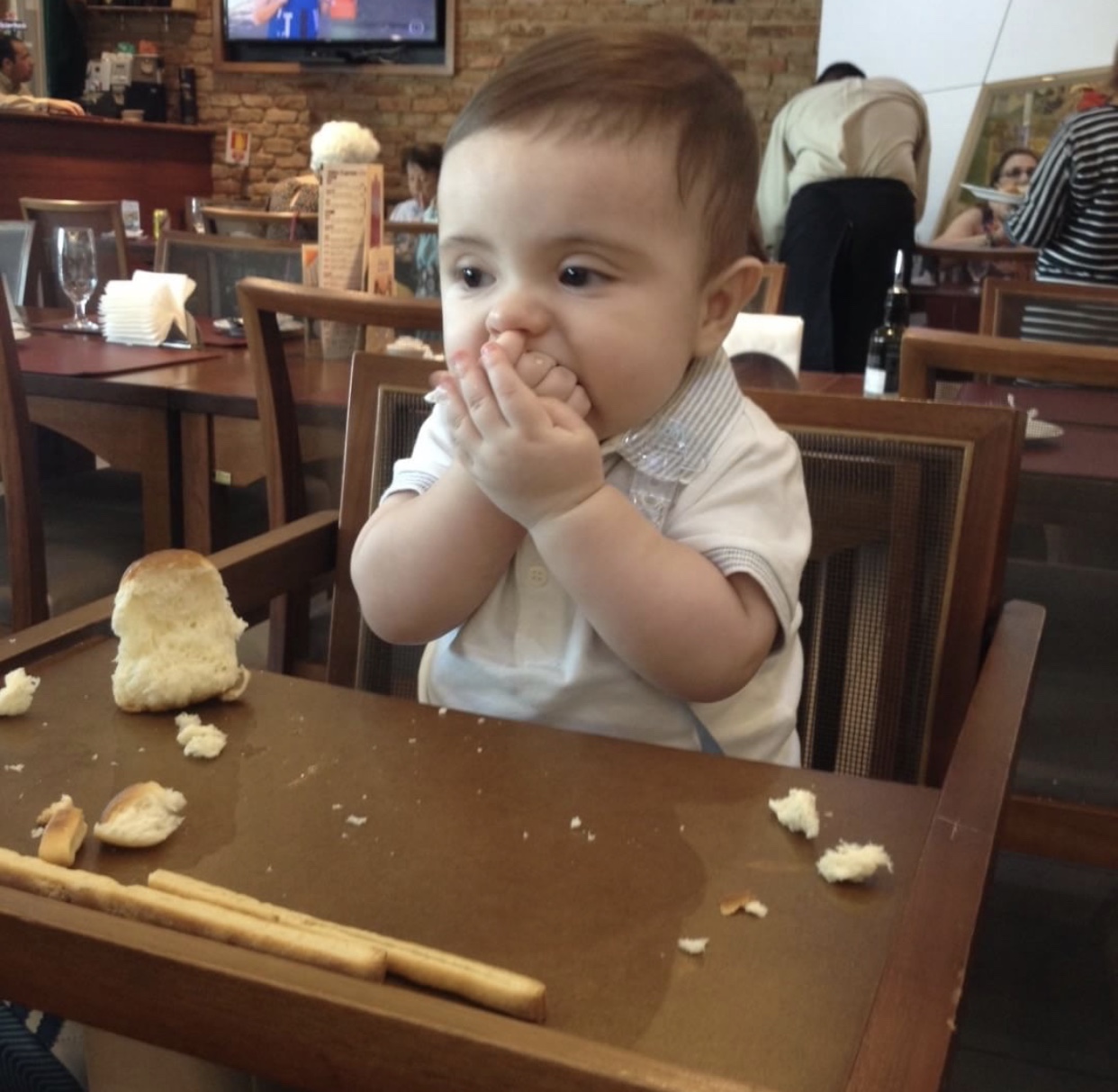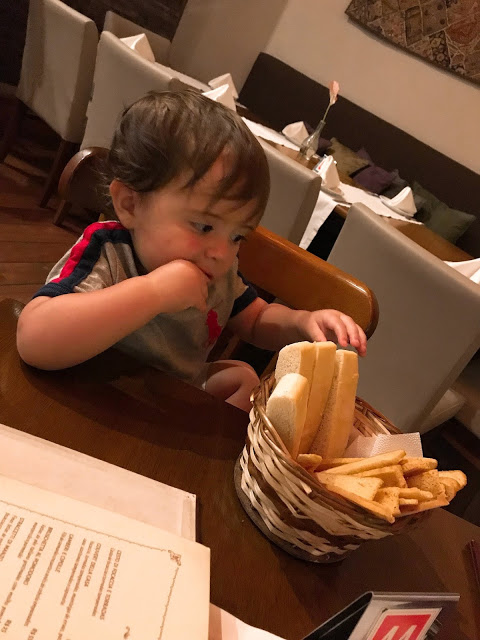 Uma coisa que a gente sempre faz é fazer ele participar da refeição, ele senta no cadeirão do restaurante, geralmente com um prato para ele e vamos dando comida que ele já possa comer, hoje ele já come tudo, mas quando começamos a sair com ele, ainda não podia comer qualquer coisa então levávamos algo que ele pudesse comer, mas dar pão era certo, ou seja couvert não pode faltar!