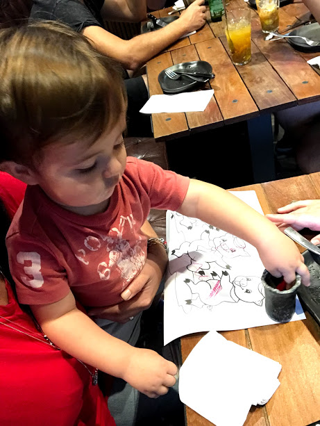 E sempre conversamos com ele, para distrair e ele não ficar entediado rápido, deixamos ele brincando com algum brinquedo dele ou giz de cera e papel que alguns restaurantes oferecem.