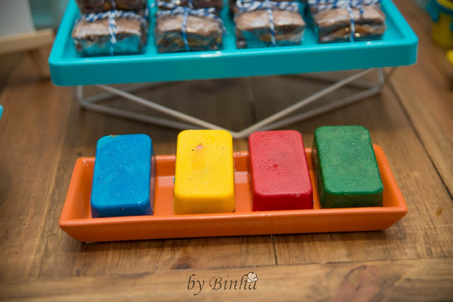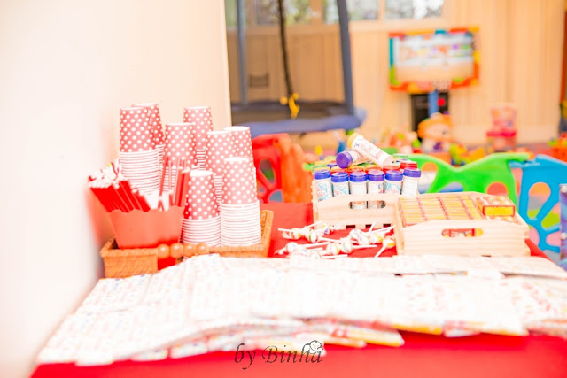 Para as lembrancinhas, também quis algo bem simples, fiz uma mesa com bolinha de sabão, estalinho e kit de pintura.