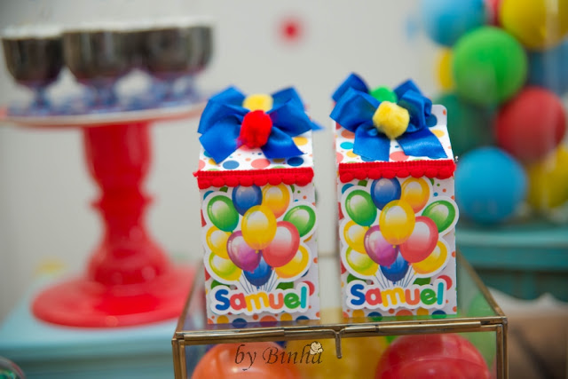 E fiz para a mesa do bolo umas latinhas em forma de baleiro cheias de doces e encomendei com a Fernanda as caixas milk com doces.