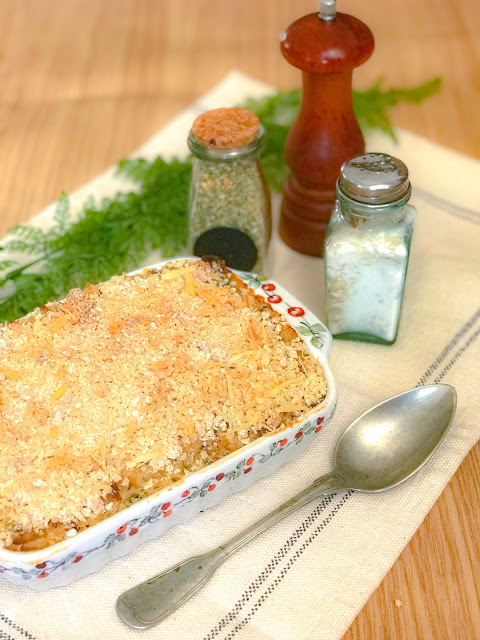 Disponha em um refratário o purê, cubra com o bacalhau, depois com a farinha com o queijo parmesão e leve ao forno pré-aquecido a 200C por mais ou menos 20 minutos ou até dourar.